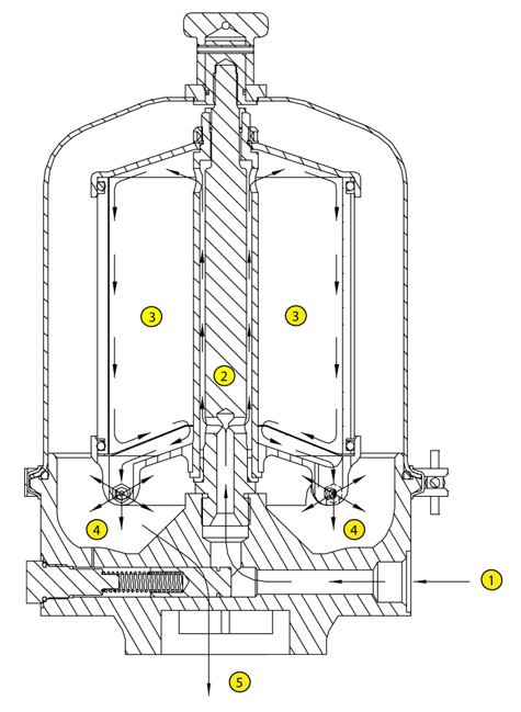 1. Pressurized oil enters Spin-Clean on bottom right. (Inlet)